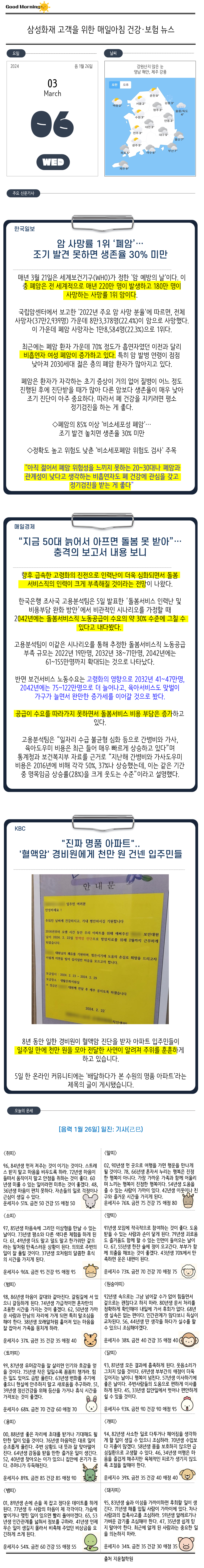 | Daily News(03.04.월) - 폐암, 보험가입, 자동차보험 (0) | 2024.03.04 |
