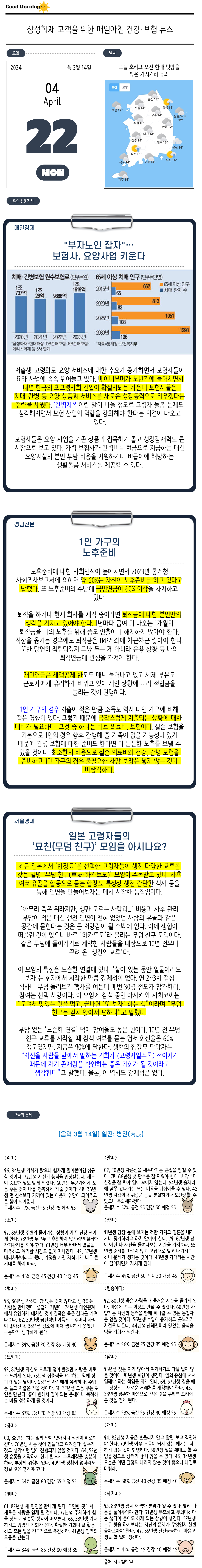 | Daily News(04.23.화) - 뇌혈관 질환 병원비용 (0) | 2024.04.26 |