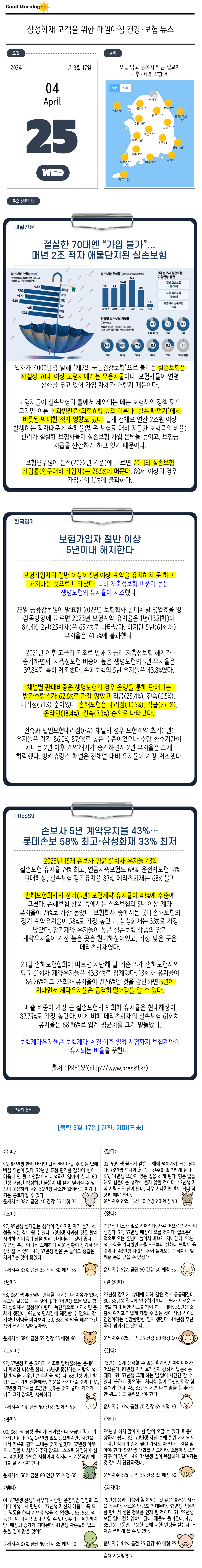 | Daily News(04.23.화) - 뇌혈관 질환 병원비용 (0) | 2024.04.26 |